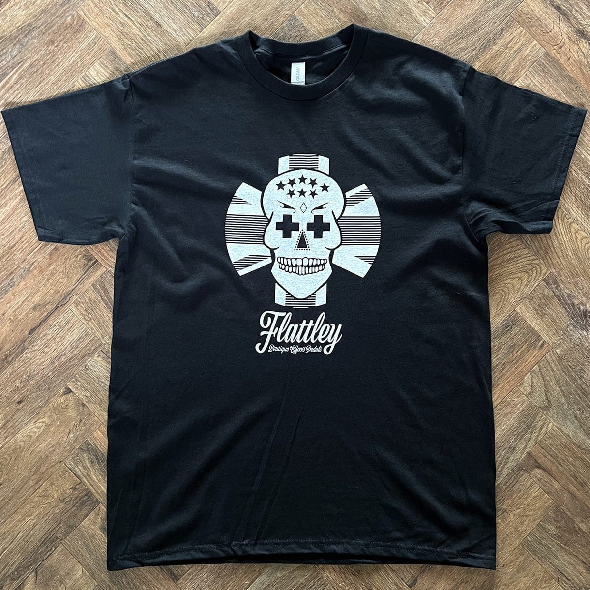 It’s screen printed in white ink on a 100% cotton black short sleeve Gildan Heavy Style tee and perfect to wear when you’re playing one of your Flattley pedals!