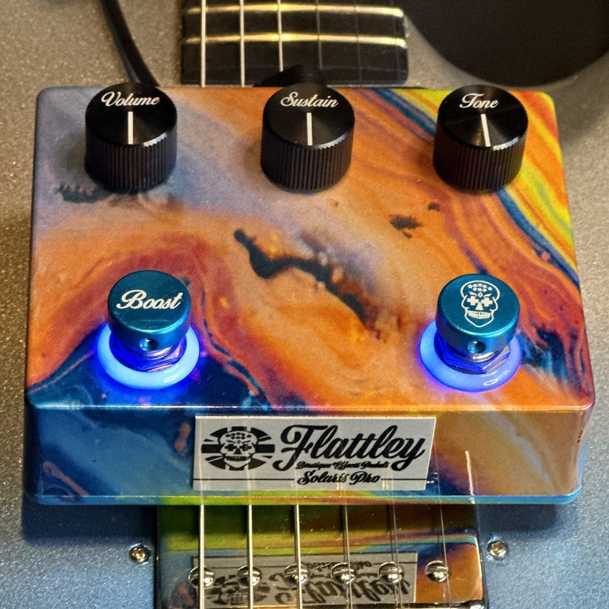 The Solaris Pro is the first fuzz that I’ve tried that does this really well. My favorite feature of this pedal is the boost. Not only does it give ample volume boost but also changes the tone and gives the fuzz more mids, which helps cut through a mix. I actually play the Solaris Pro with the boost On all the time. The pedal also stacks incredibly well with other pedals. I have a Wampler Belle (based on a Nobles ODR-1), a Green Rhino (a TS808) and a WTB+ (treble booster) and it takes all of them extremely well.